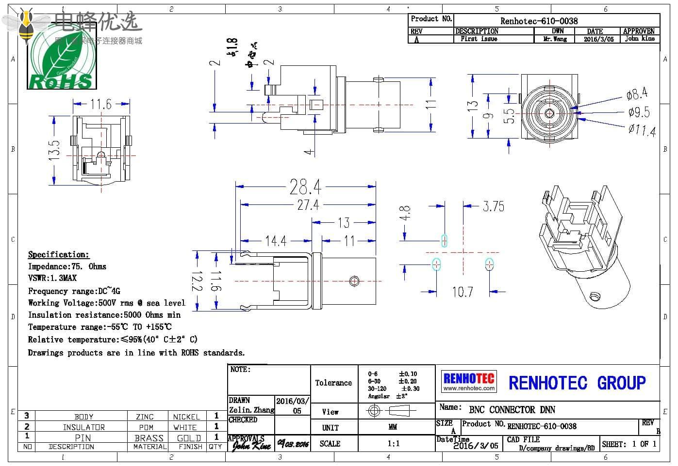 - PCB板端,母头,直式,锌合金,RF射频同轴,BNC连接器,75欧姆;