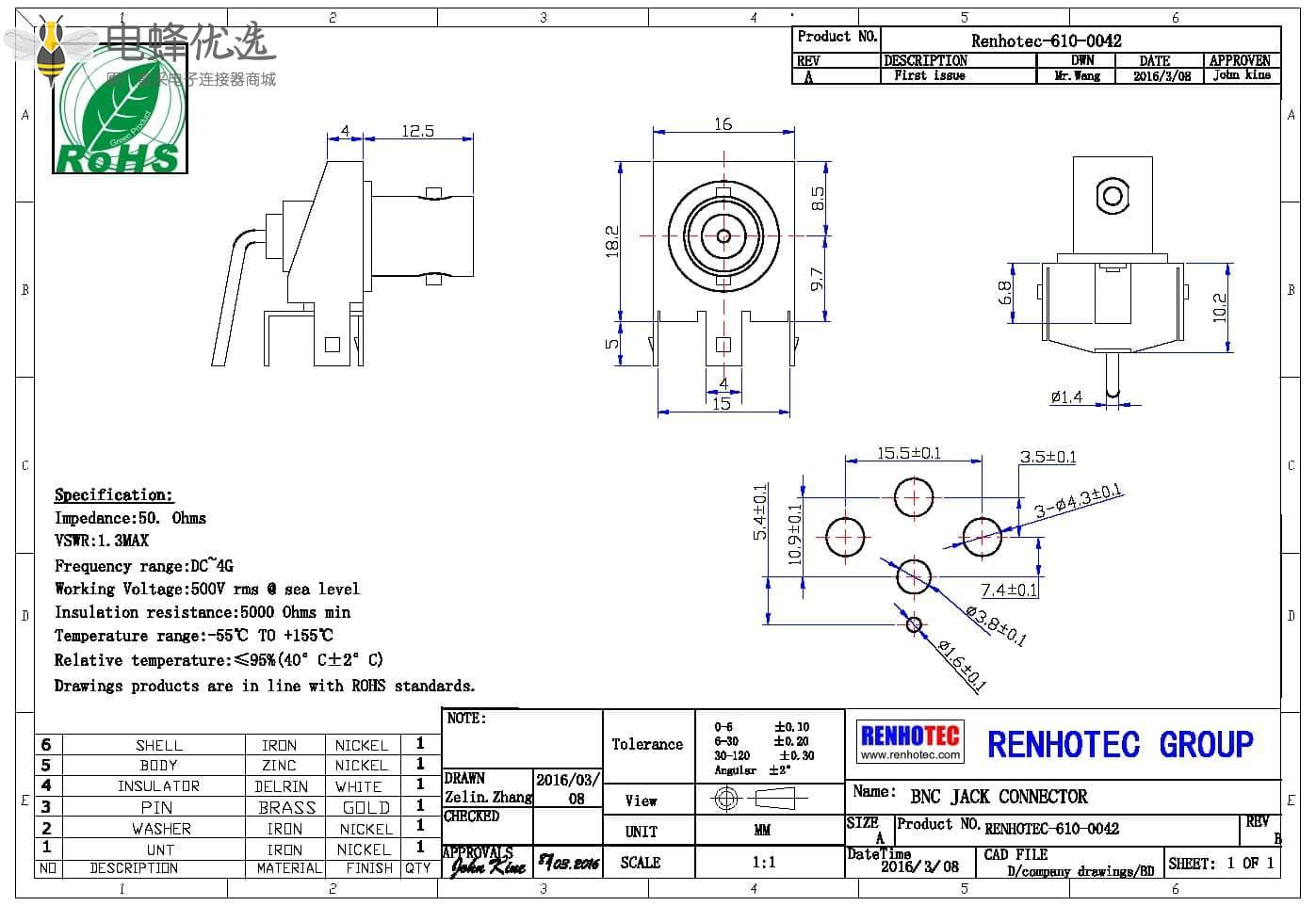 - PCB板端,母头,弯式,锌合金,RF射频同轴,BNC连接器,50欧姆;