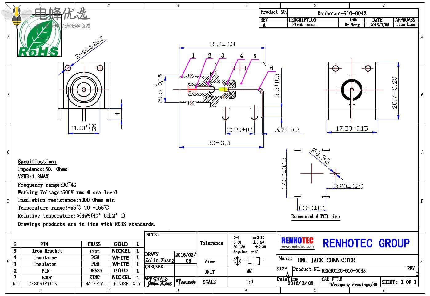 - 中心接触电阻:≦ 1.5 mΩ (Milliohms max.)