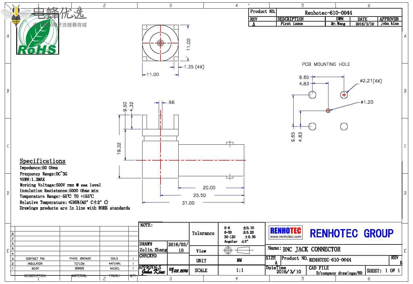 - PCB板端,母头,弯式,锌合金,RF射频同轴,BNC连接器,50欧姆,4脚;