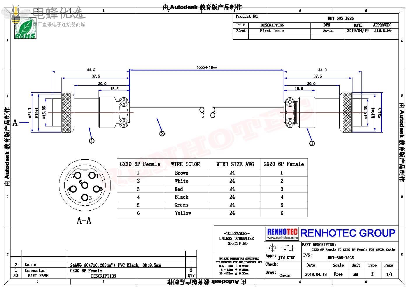 - GX20,对接款,线束,6芯,双边线,母转母,直式,接线