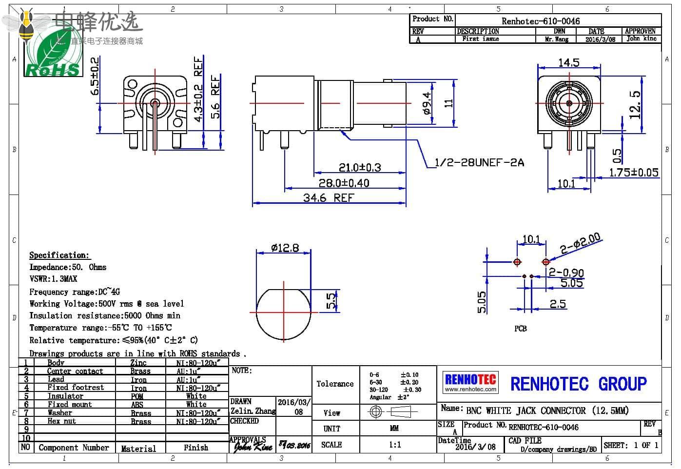 - 中心接触电阻:≦ 1.5 mΩ (Milliohms max.)