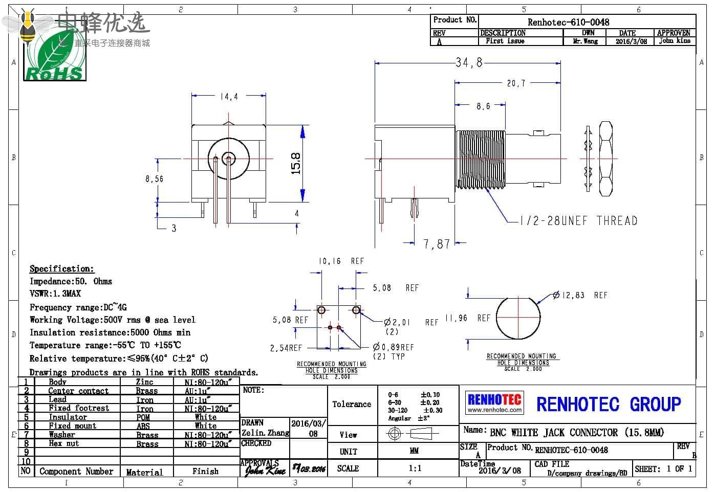 - PCB板端,母头,直式,RF射频同轴,BNC连接器,穿墙,50欧姆,白色;