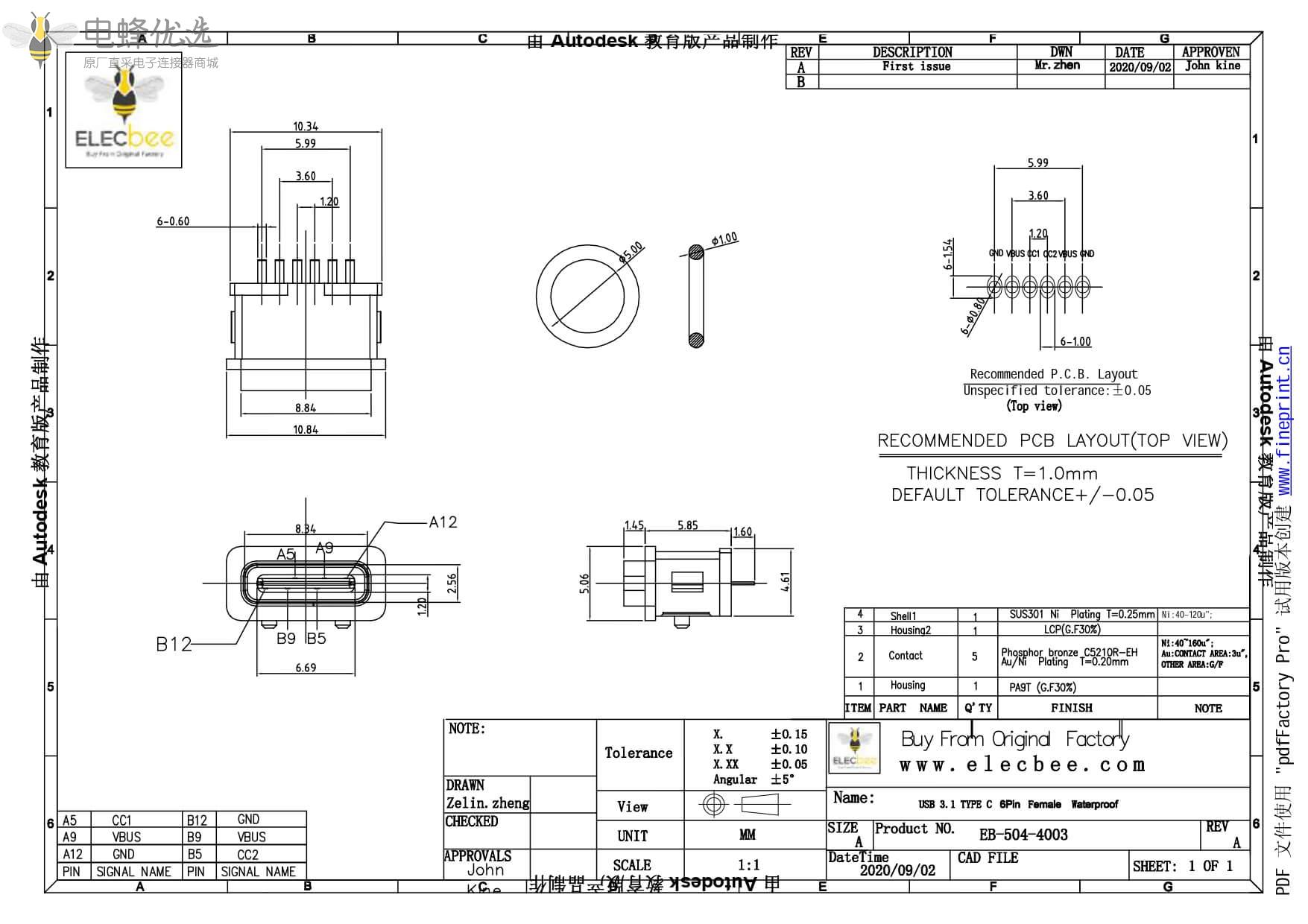 - 防水Type-c,母座,6芯,IPX8,贴板,直