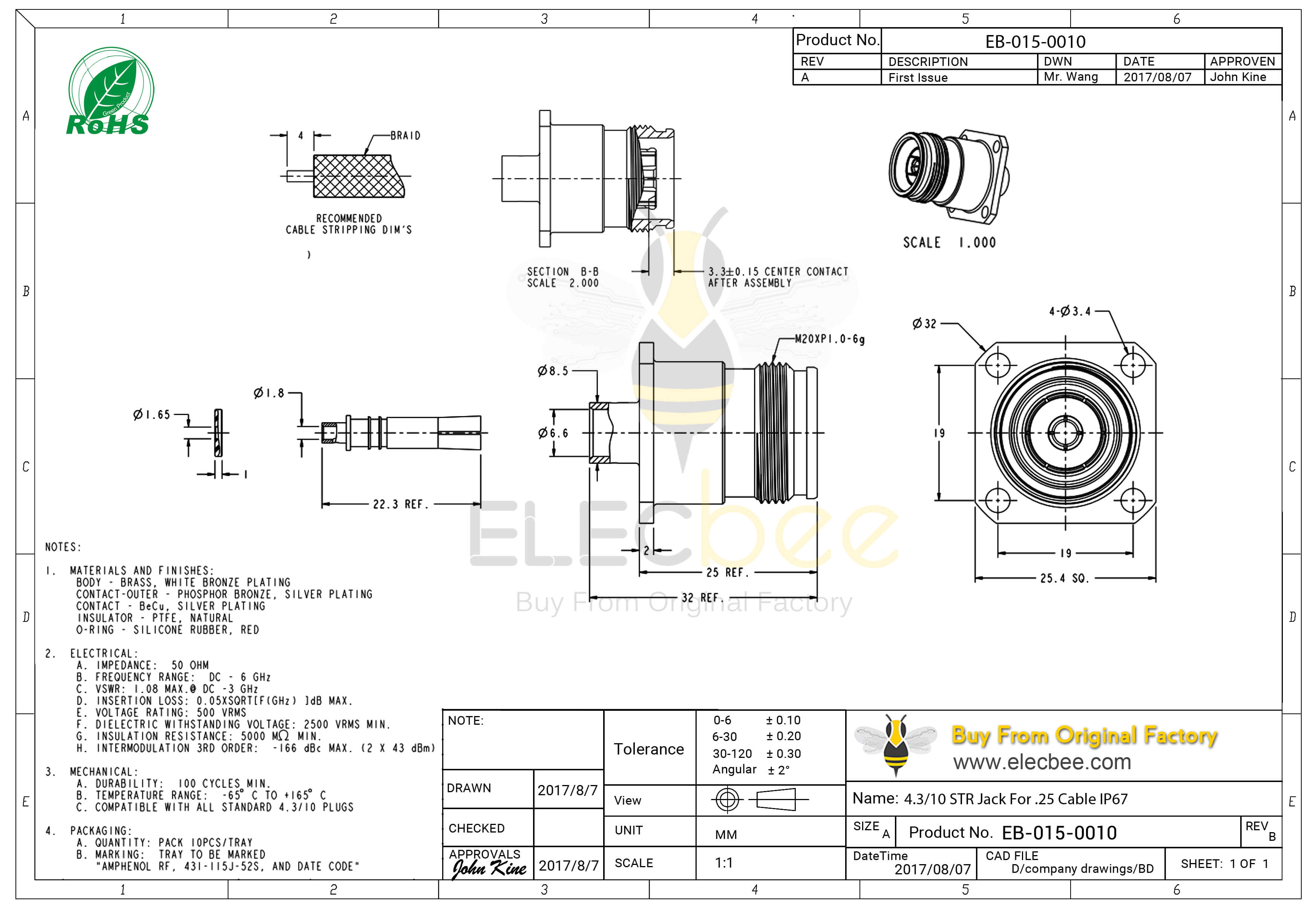 - RF连接器,4.3-10连接器,直式,母头,螺母锁紧,四孔法兰,50欧姆,接.250"半刚性线