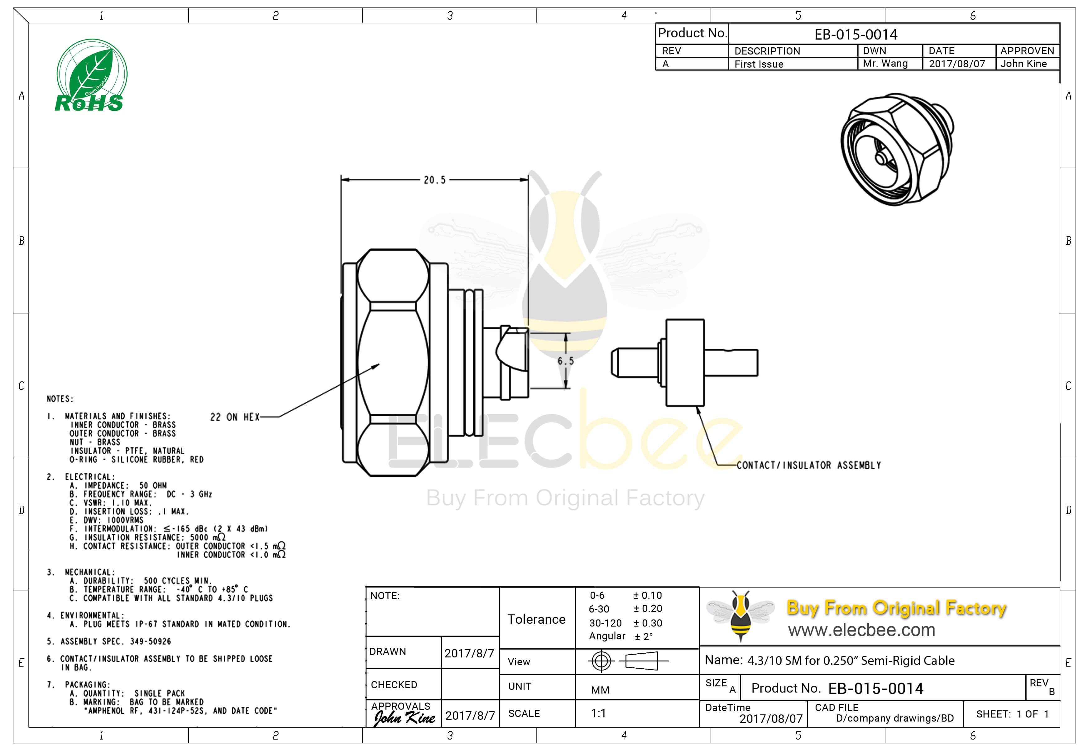 - RF连接器,4.3-10连接器,直式,公头,螺母锁紧,50欧姆,防尘,接.250"半刚性线