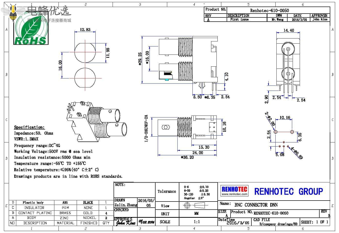 - PCB板端,母头,弯式,黑色,RF射频同轴,BNC连接器,50欧姆,穿墙;