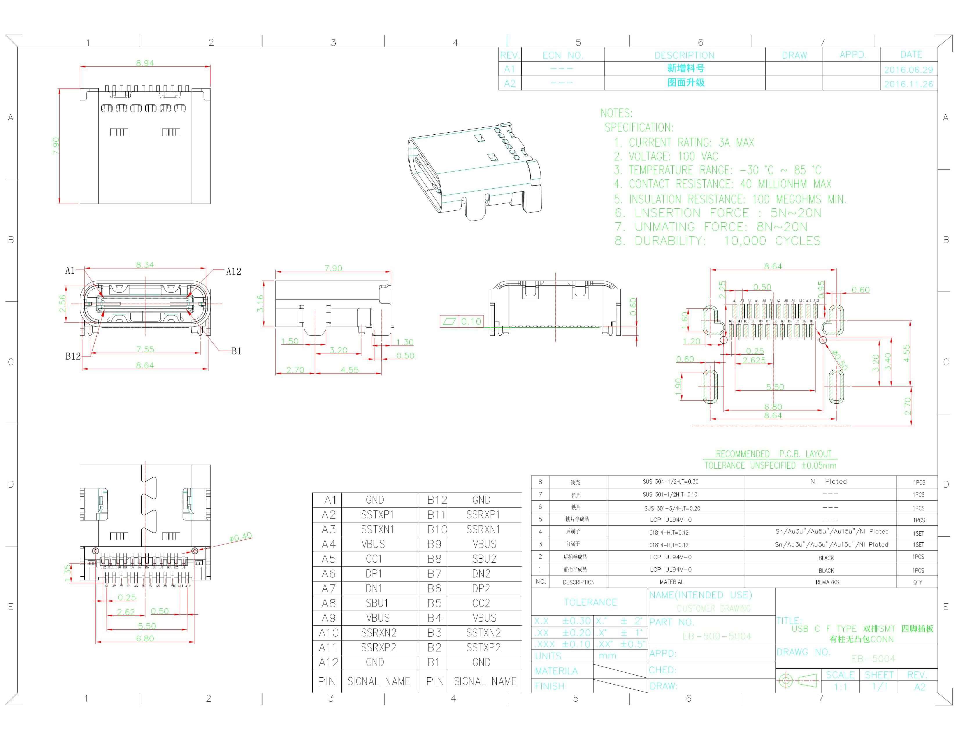 - USB3.0,Type C,母座,直式,卡板式,接PCB板