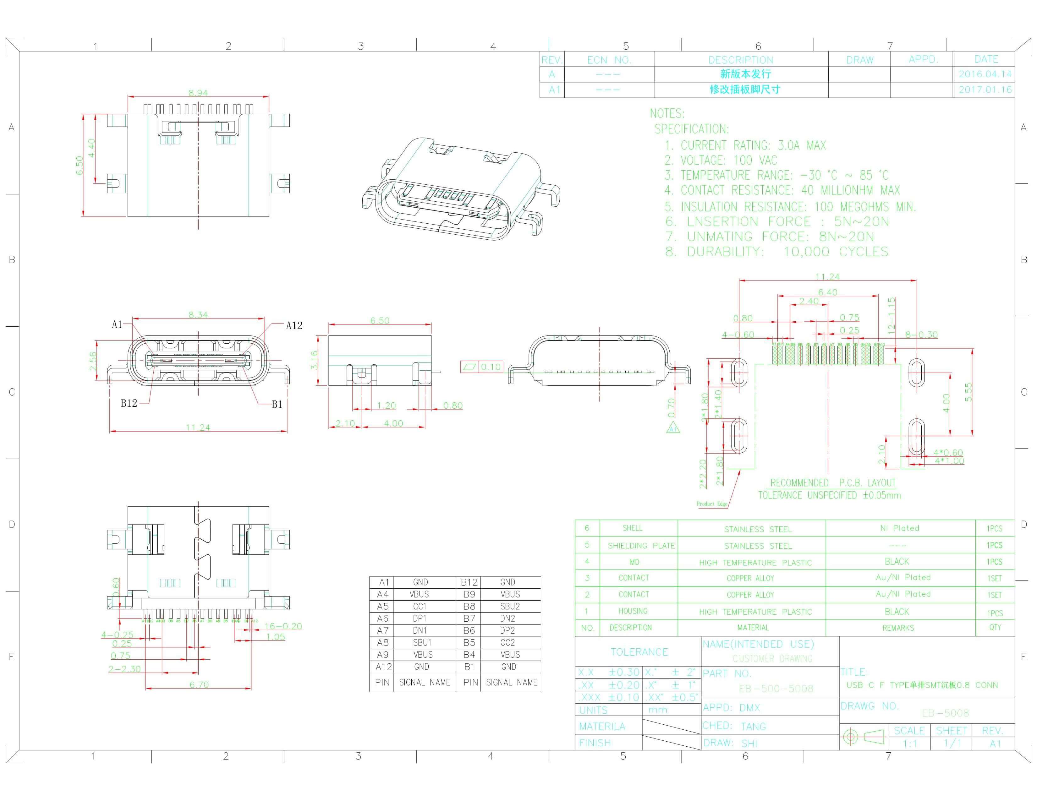 - USB3.0,Type C,母座,弯头,沉板,接PCB板