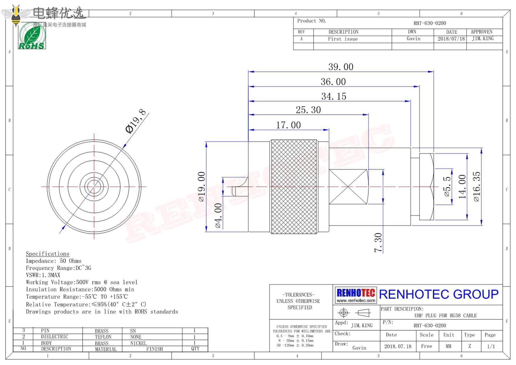 - UHF连接器,公头,直式,180度,接线,螺母锁紧,RG58;