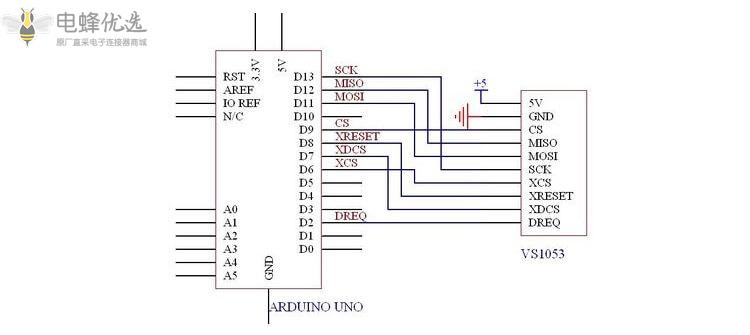 - 连接到VS1053分支板后,将SD卡插入到SD卡插槽中,SD卡将存储您的mp3文件的文件名称如“track001.mp3”,“track002.mp3”等;
