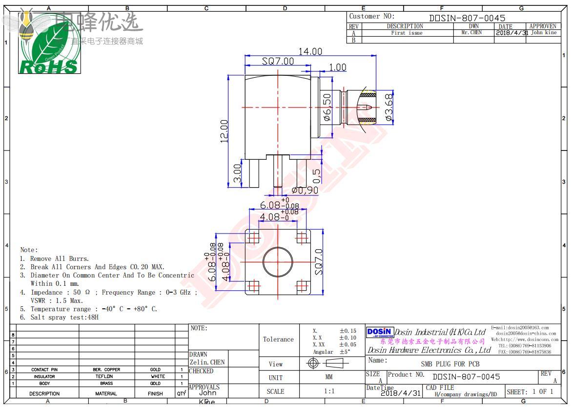 - 配接耐久性:大于500次 (使用铍铜中心针时)