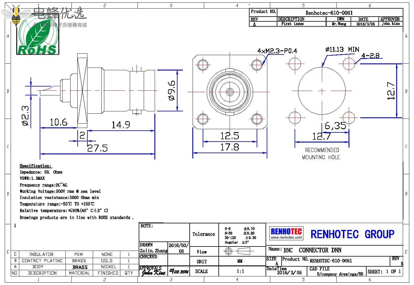 - PCB板端,母头,直式,锌合金,RF射频同轴,BNC连接器,50欧姆,4孔,方形法兰;
