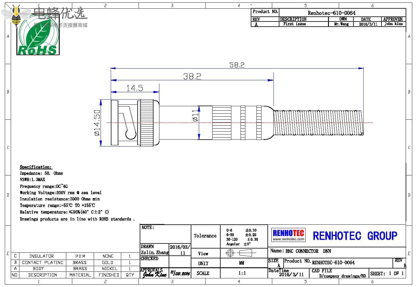 - 连接线,公头,直式,锌合金,50欧姆,RF射频同轴,BNC连接器;