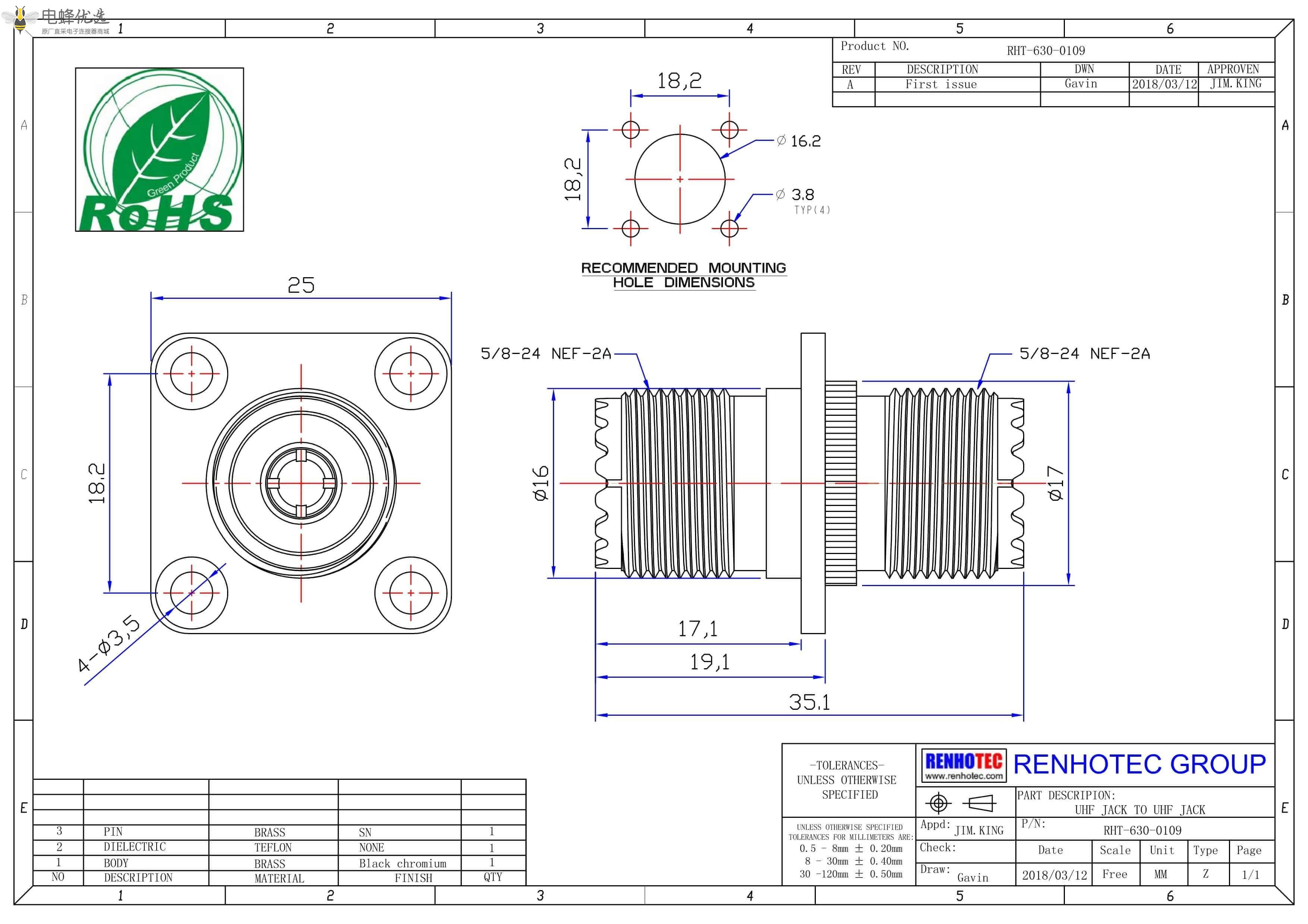 TFE insulators: -65°C ~ +165°C - 耐环境性:除非特殊标注,所有UHF系列连接器均不具有耐环境性能。
