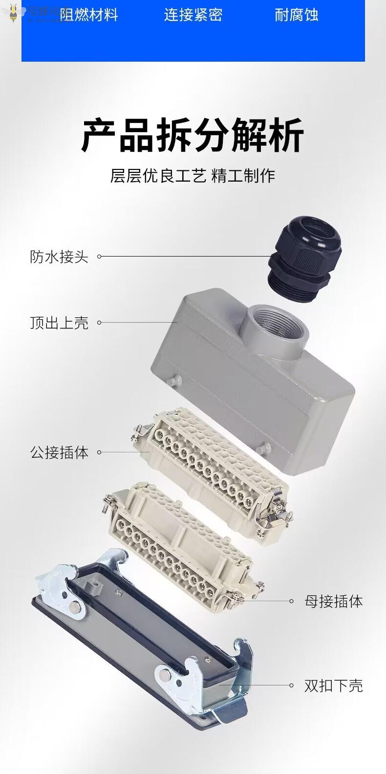 16芯重载连接器H16B双扣下壳PC料内芯厂家批发矩形工业连接器