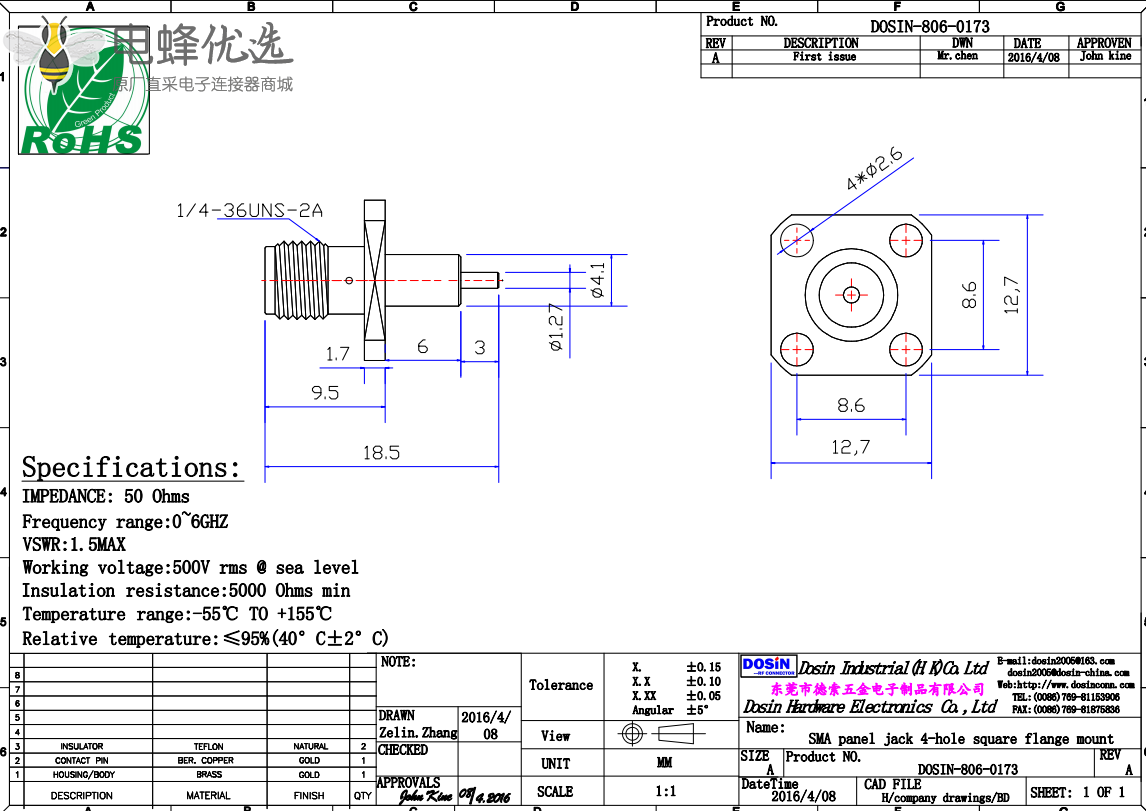 - SMA连接器,直式,母头,四孔法兰,PTFE,插孔,PCB板;