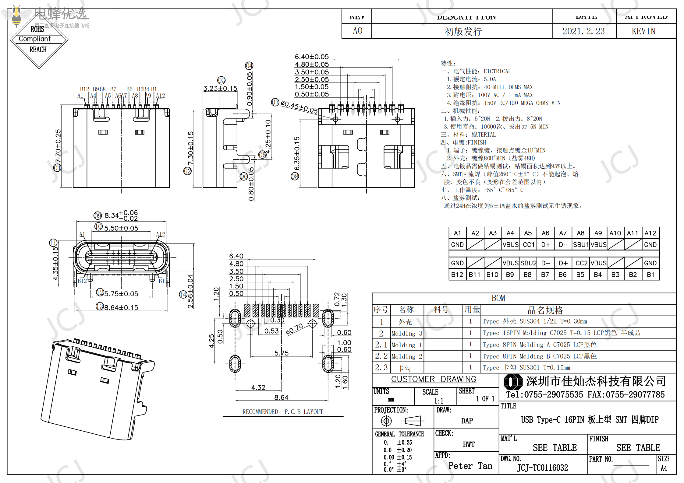1.端 子:镀 镍 镀,接 触 点 镀 金1U"MIN