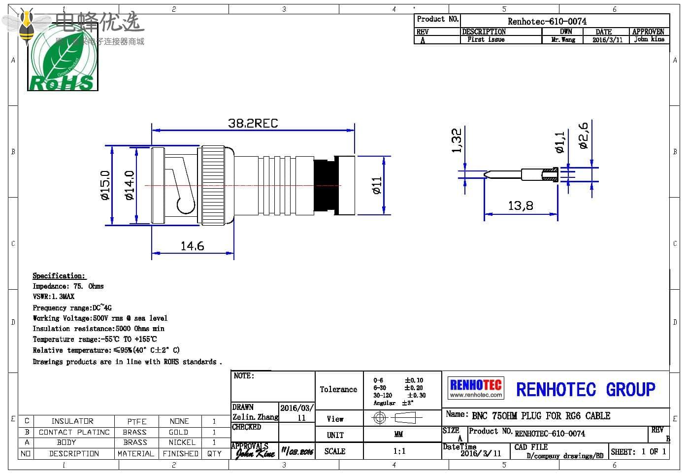 - 连接线,直式,公头,锌合金,75欧姆,RF射频同轴,BNC连接器,电缆;