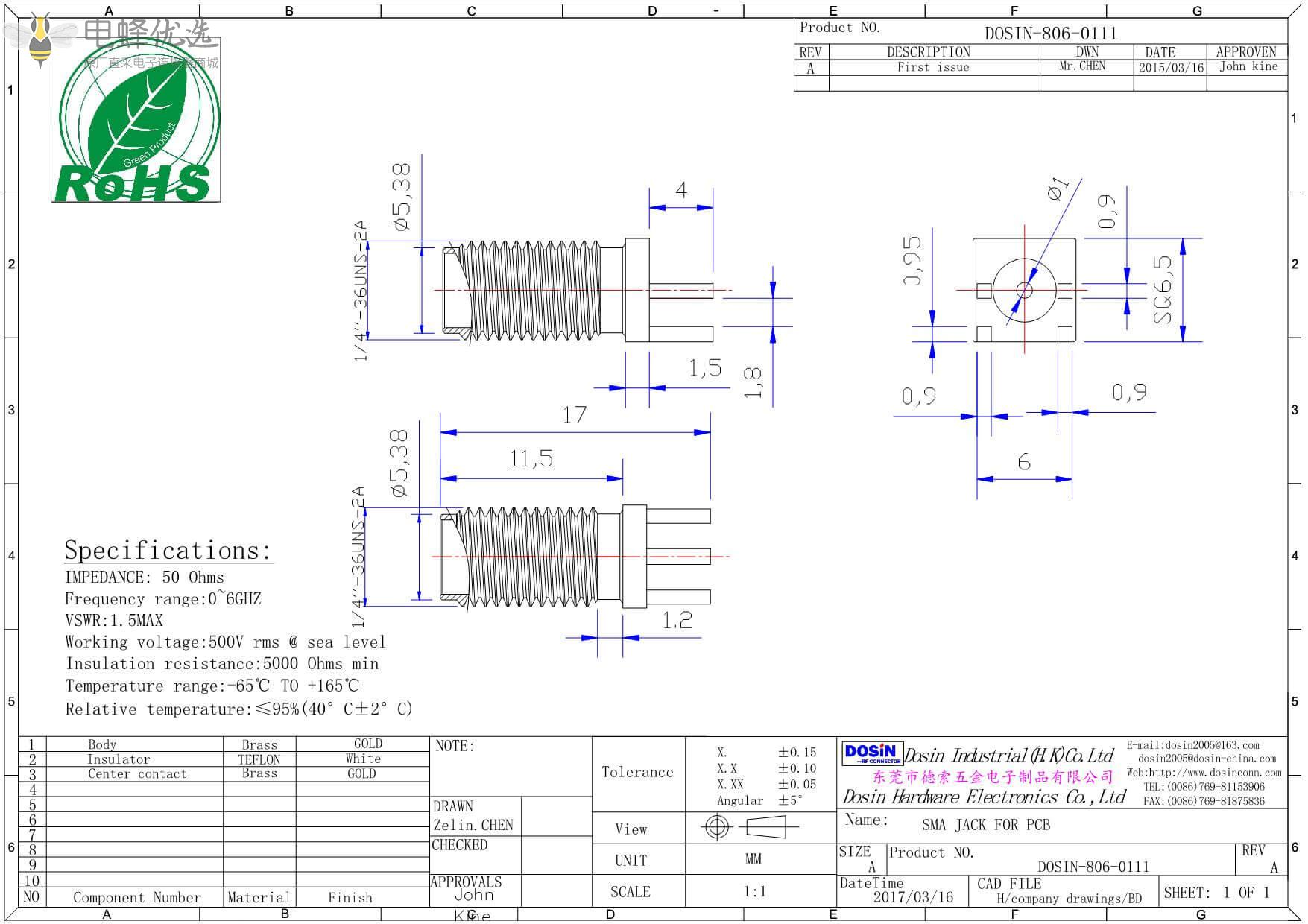 - 中心接触电阻:≦ 6.0mΩ (Milliohms max.)