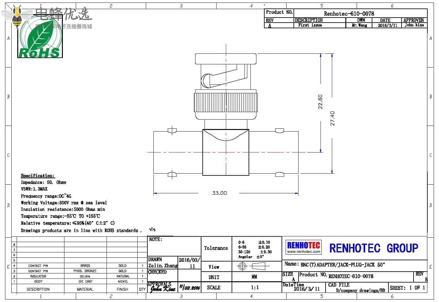- 中心接触电阻:≦ 1.5 mΩ (Milliohms max.)
