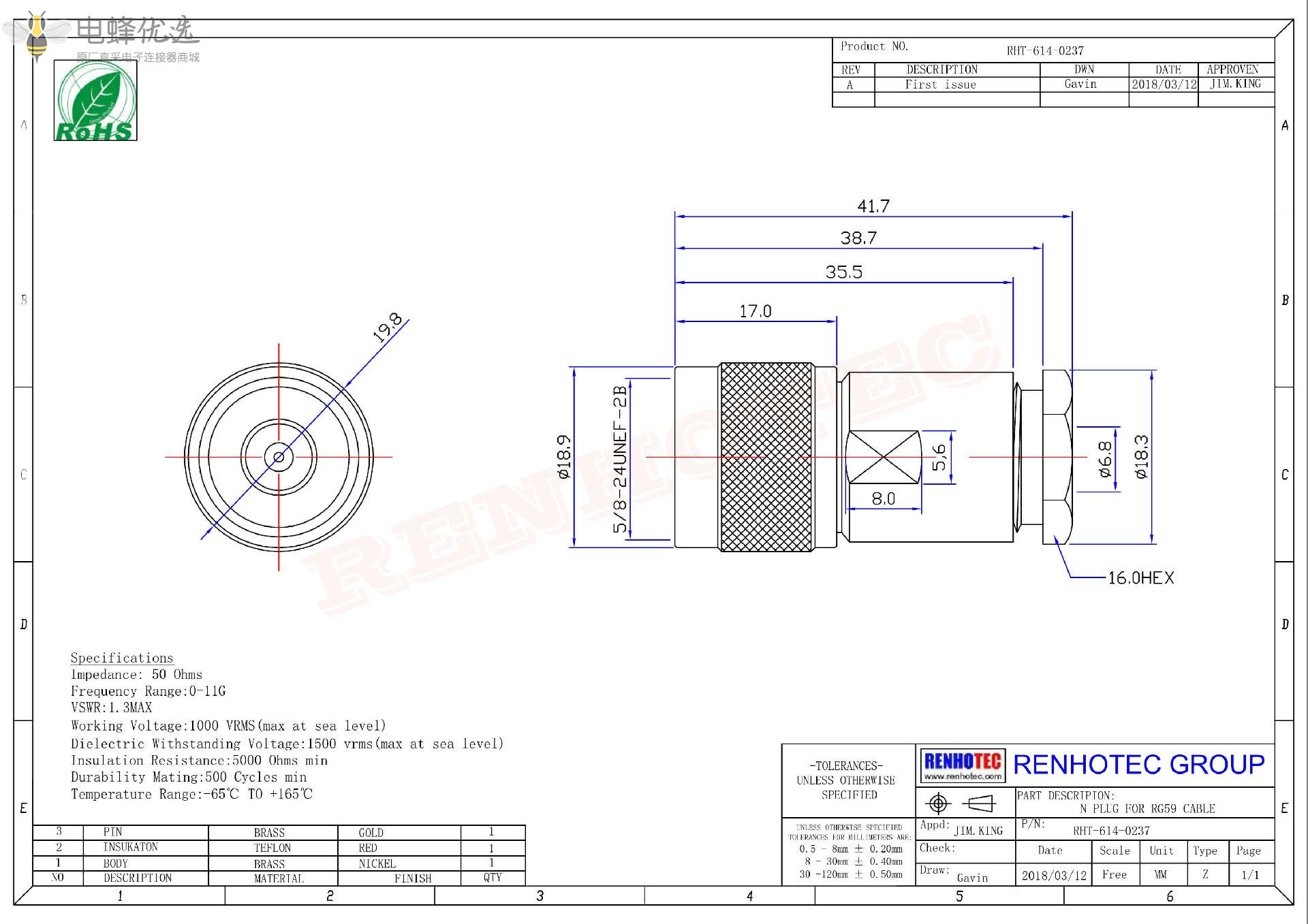 - 高性能连接器,频率范围达0到11GHz,阻抗50欧姆;
