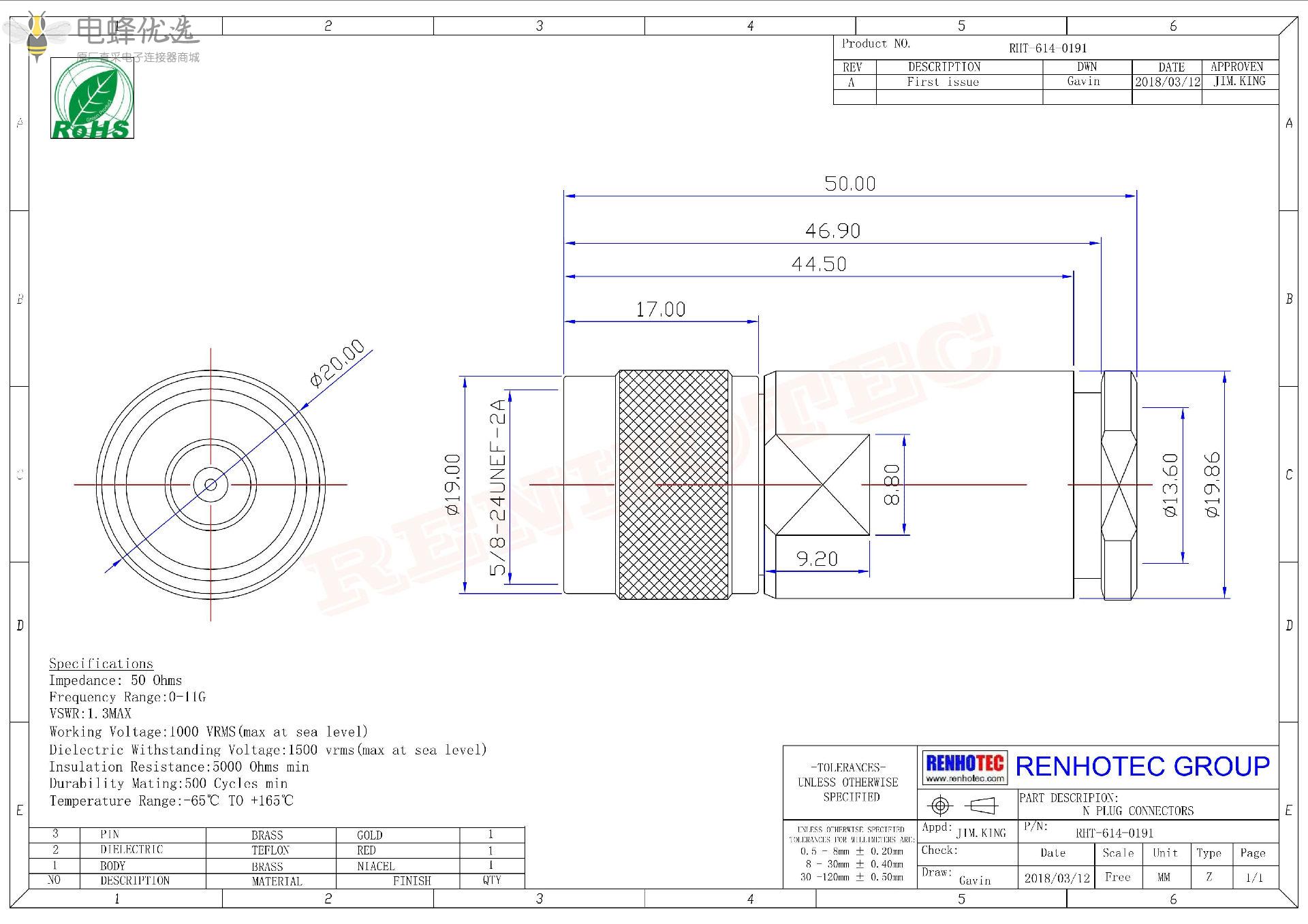 - 中心接触电阻: ≦ 1.0 mΩ (Milliohms max.)