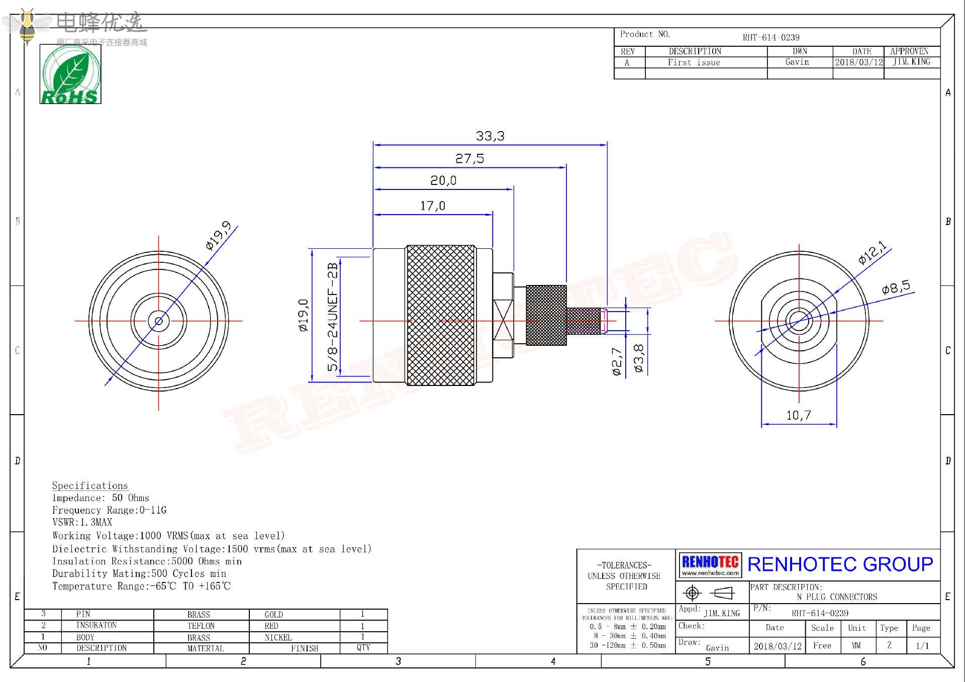 - 高性能连接器,频率范围达0到11GHz,阻抗50欧姆;