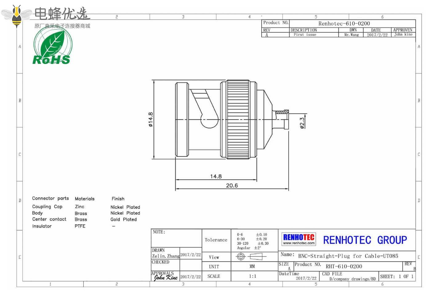 - 连接线,直式,公头,锌合金,50欧姆,RF射频同轴,BNC连接器,电缆