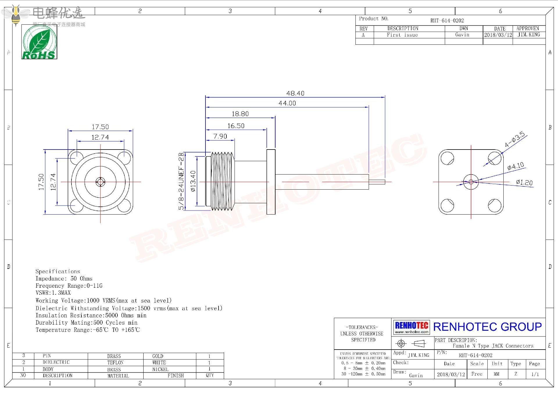 - N型连接器,直式,母头,四孔法兰,射频同轴连接器;