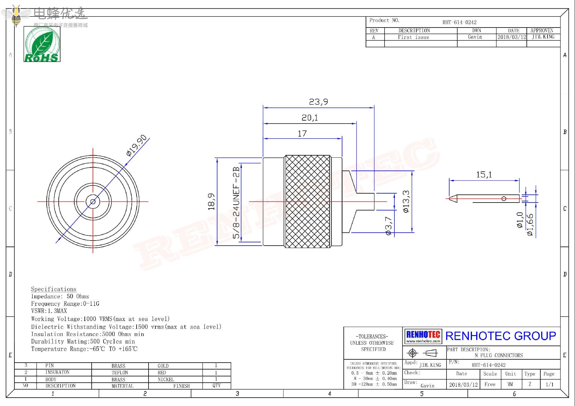 - 高性能连接器,频率范围达0到11GHz,阻抗50欧姆;