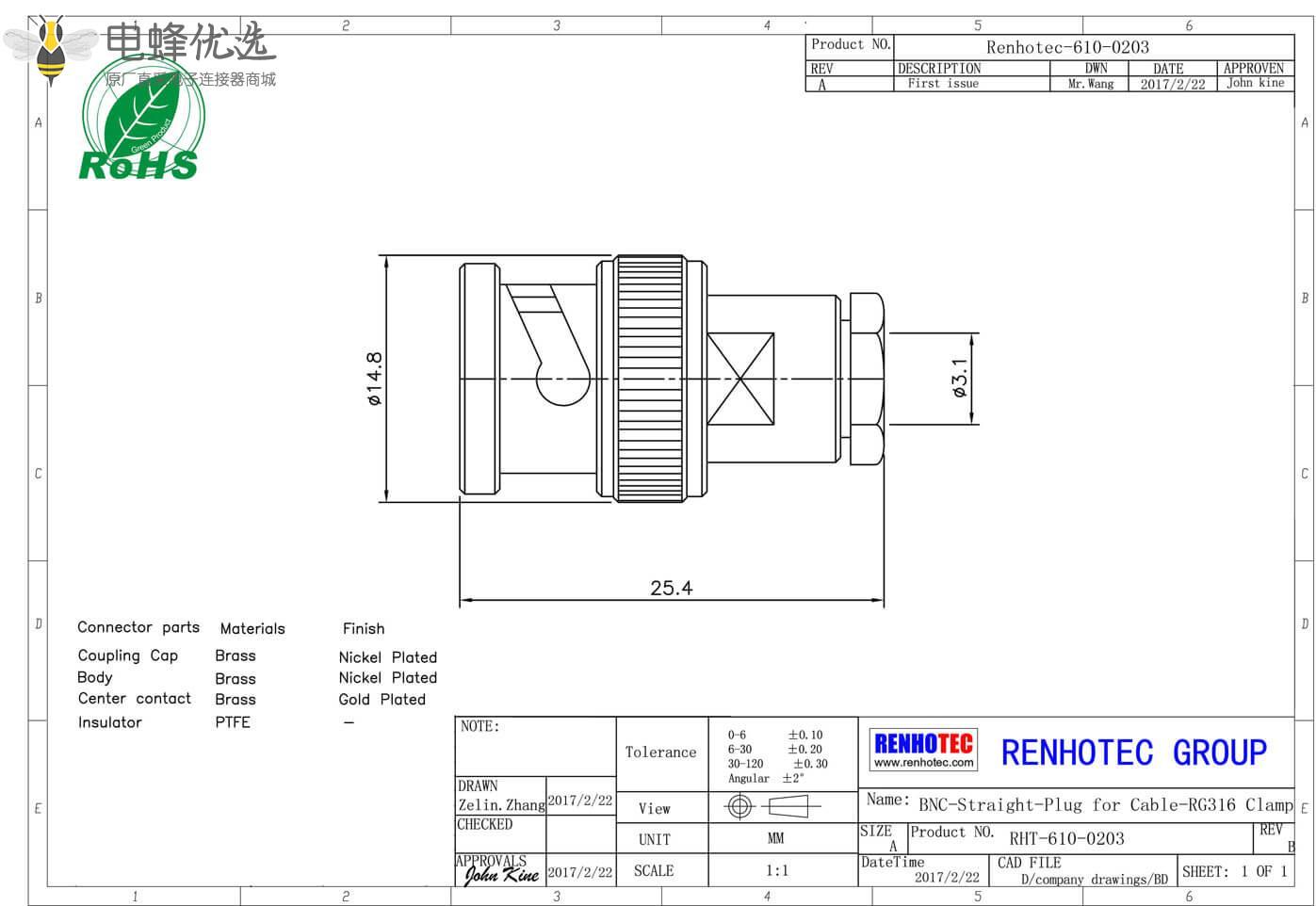 - 连接线,直式,公头,锌合金,50欧姆,RF射频同轴,BNC连接器,电缆