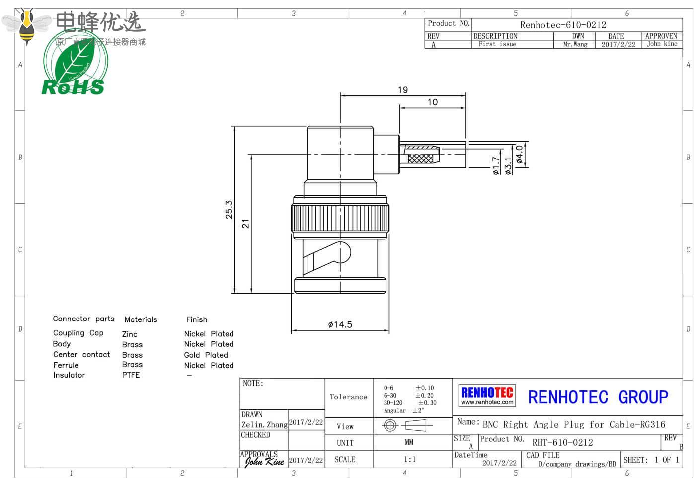 - 连接线,弯式,公头,锌合金,50欧姆,RF射频同轴,BNC连接器,电缆