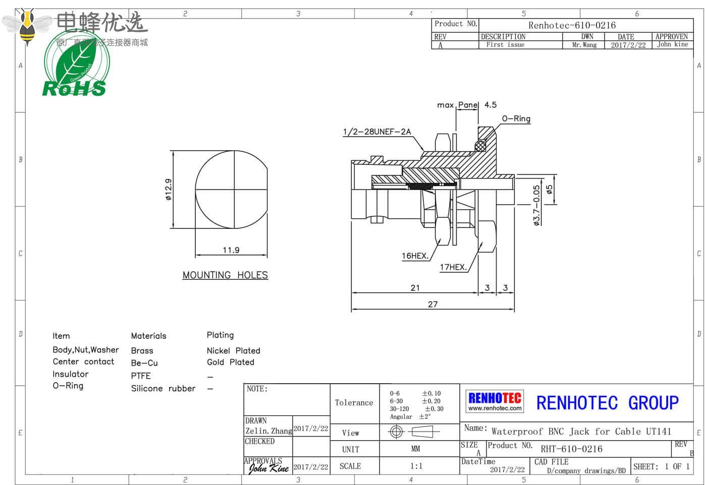 - 中心接触电阻:≦ 1.5 mΩ (Milliohms max.)