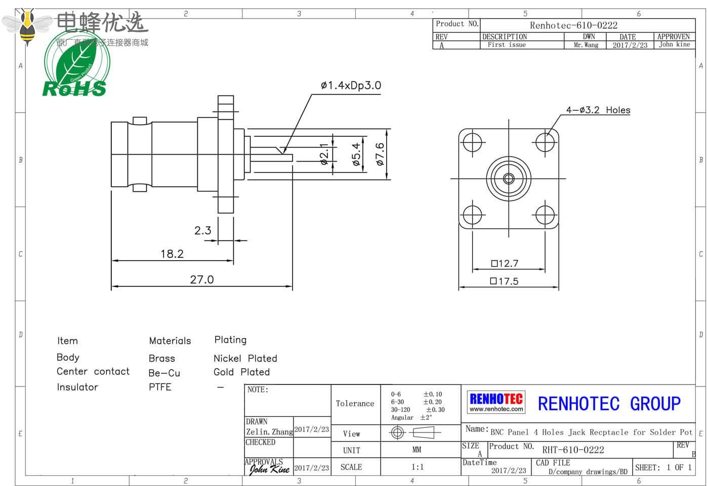 - PCB板端,直式,母头,锌合金,50欧姆,RF射频同轴,BNC连接器,4孔方形法兰