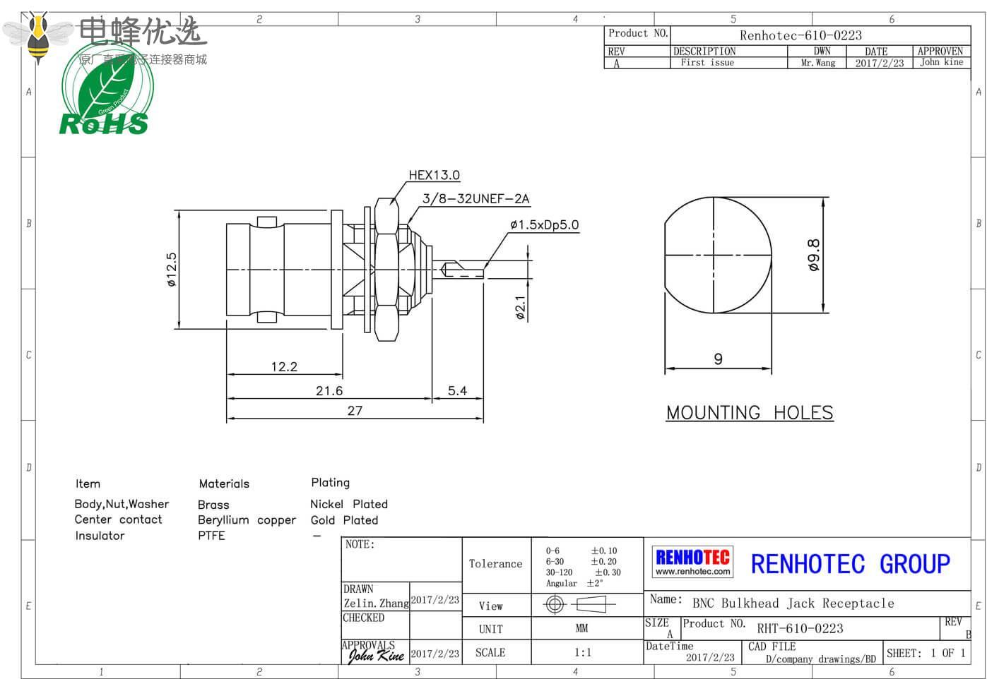 - 中心接触电阻:≦ 1.5 mΩ (Milliohms max.)