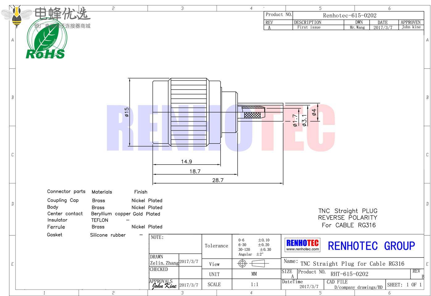 - 同轴线缆,插头,直式,压接,tnc连接器,RG316,反极;