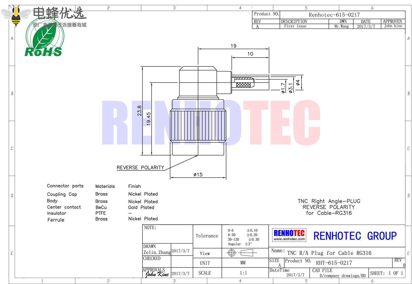 - 同轴线缆,插头,反极,弯式,压接,tnc连接器,RG316;