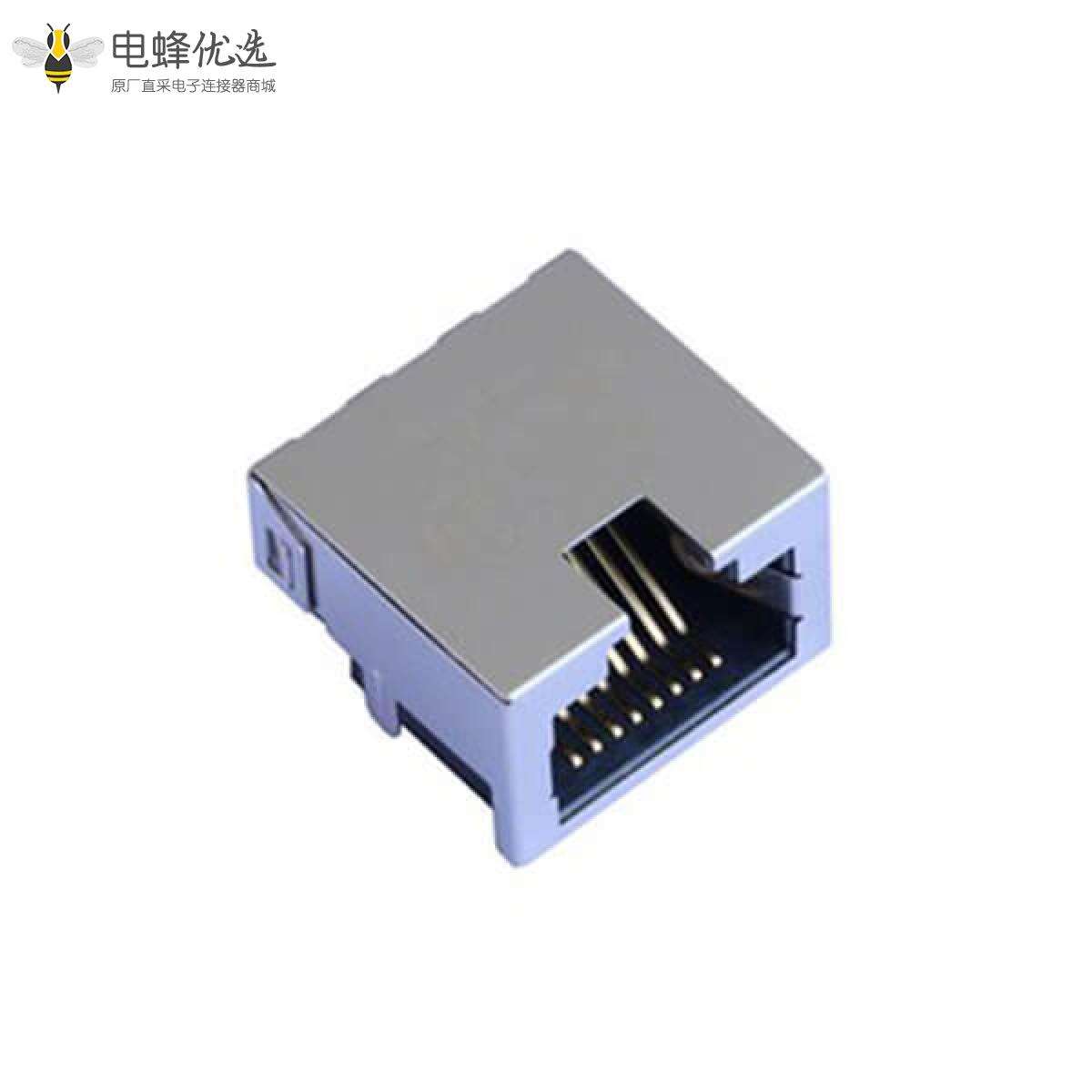 - RJ45连接器,母座,PCB板,8P8C,1*1,单层,单口,弯式,非屏蔽,不带弹片,不带灯,不带滤波器,铜壳,镀镍;
