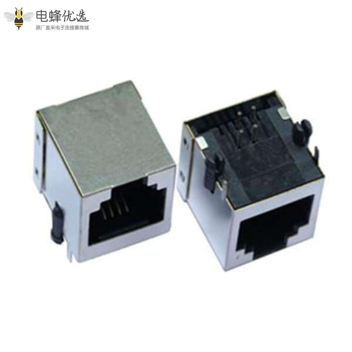 - RJ45连接器,母座,PCB板,8P8C,1*1,单层,单口,弯式,非屏蔽,不带弹片,不带灯,不带滤波器,铜壳,镀镍;