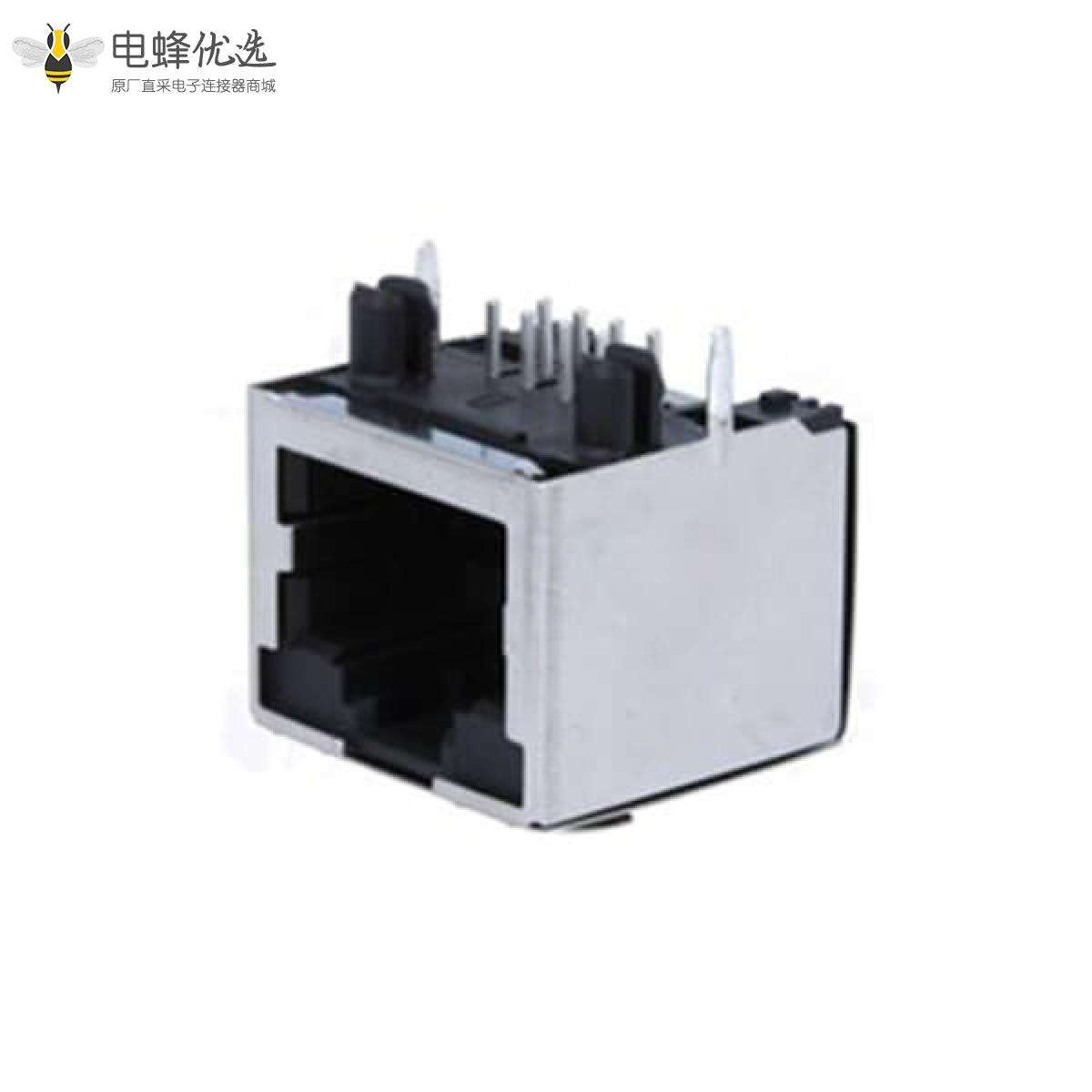 - RJ45连接器,母座,PCB板,8P8C,1*1,单层,单口,弯式,屏蔽,不带弹片,不带灯,不带滤波器,铜壳,镀镍;