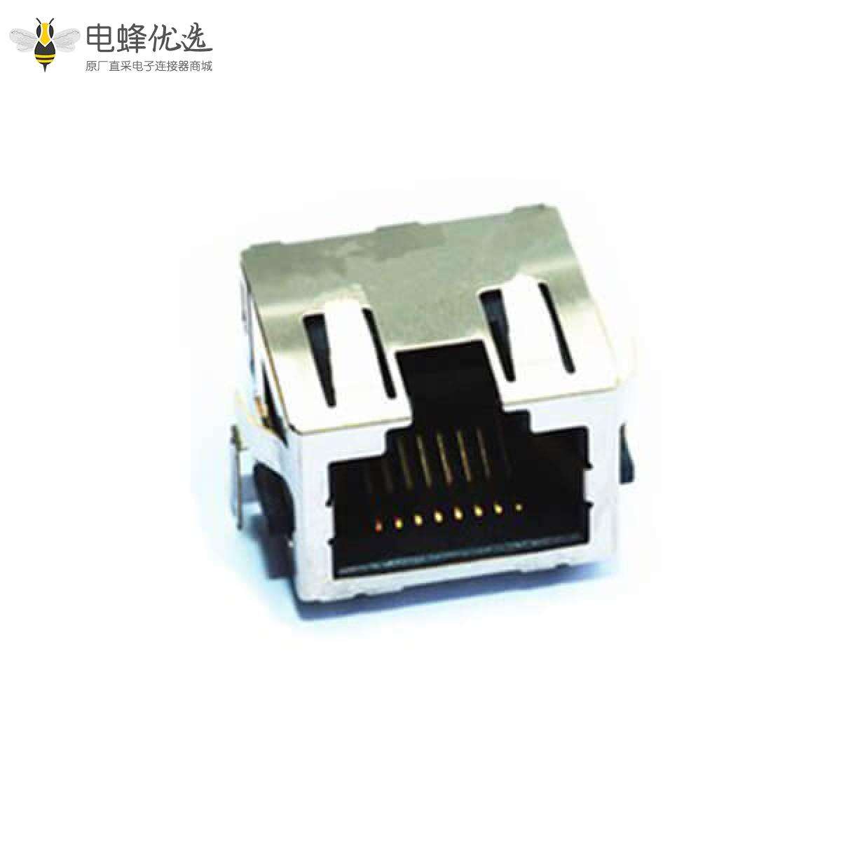 RJ45连接器,母座,PCB板,8P8C,1*1,单层,单口,弯式,屏蔽,不带弹片,不带灯,不带滤波器,铜壳,镀镍;