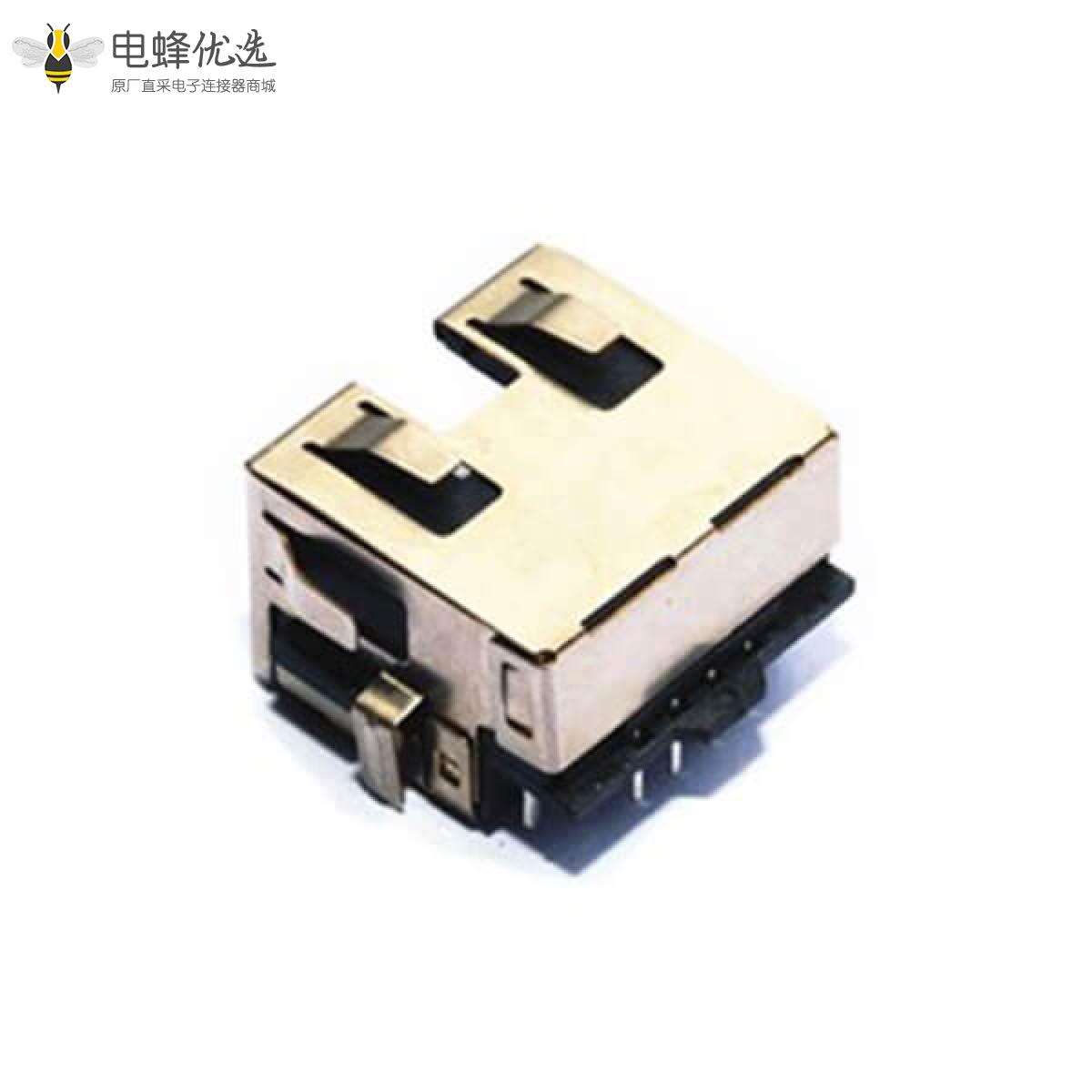 - RJ45连接器,母座,PCB板,8P8C,1*1,单层,单口,弯式,屏蔽,带弹片,带灯,不带滤波器,铜壳,镀镍;