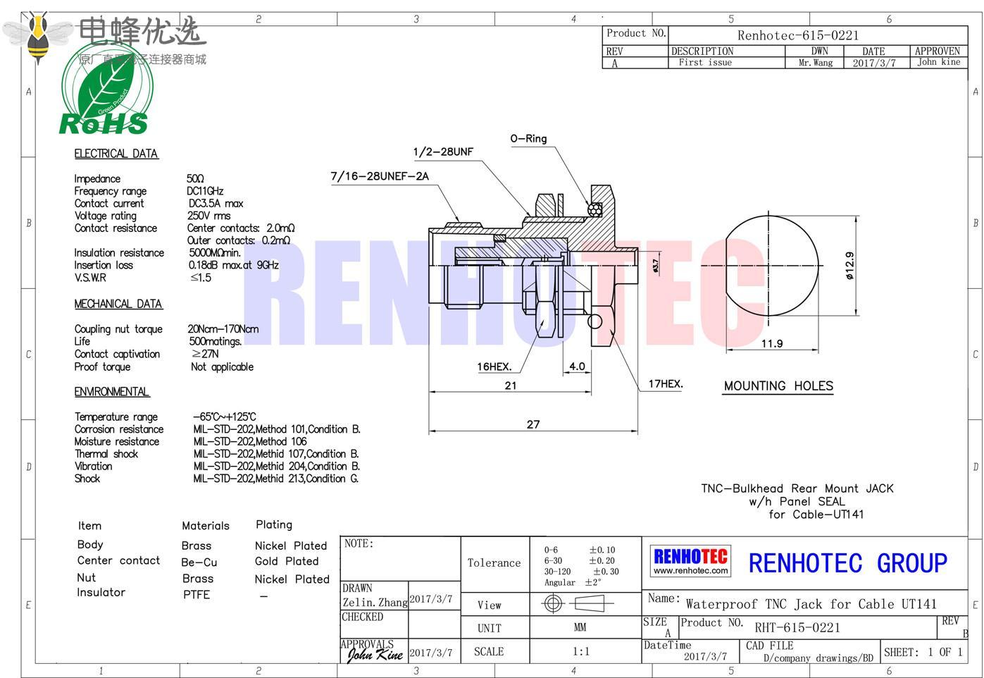 - 同轴线缆,母头,直式,穿墙,tnc连接器,UT141,面板安装;