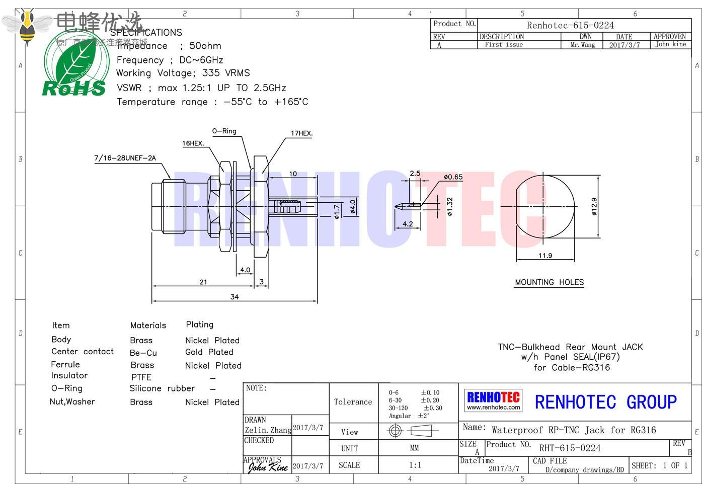 - 同轴线缆,插座,反极,直式,穿墙,tnc连接器,RG316,面板安装,防水;