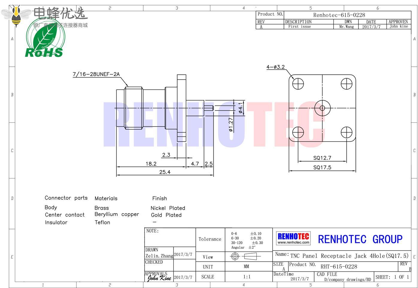 - 面板安装,母头,直式,4孔法兰,tnc连接器;