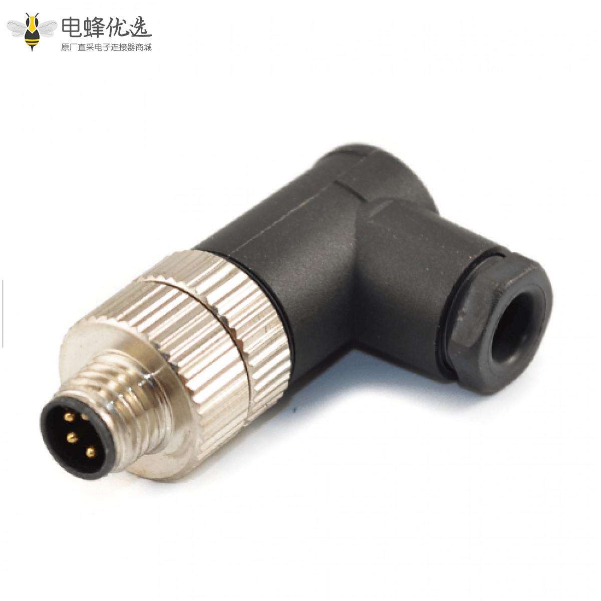 - M8, 4芯, A编码, 组装接头, 公, 现场组装式, 弯的, 螺丝锁线, 不带屏蔽 ;