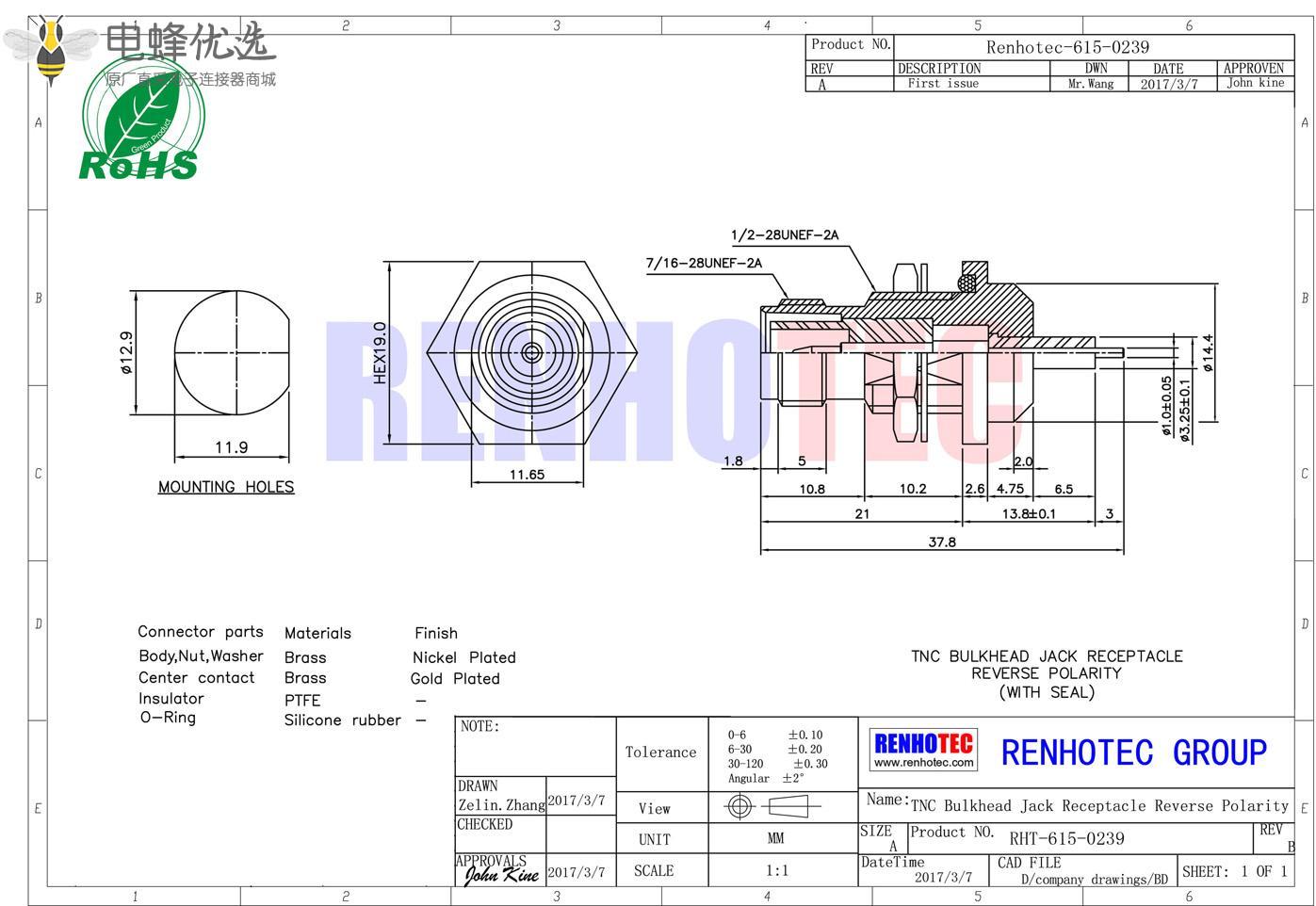 - 面板安装,插座,直式,穿墙,tnc连接器,反极;