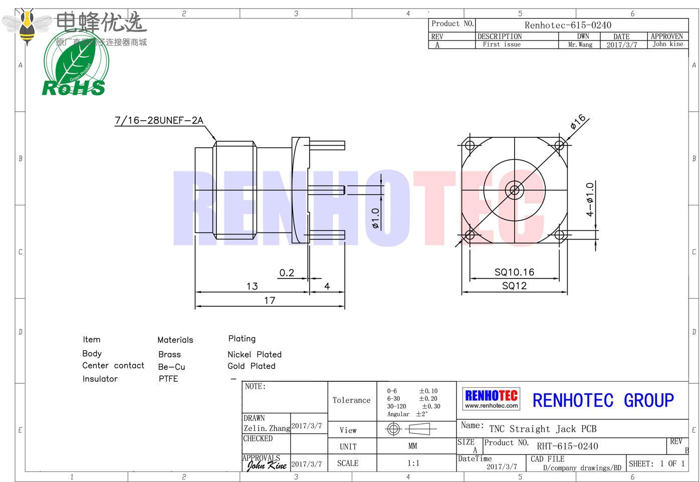 - PCB板端,直式,母头,tnc连接器;
