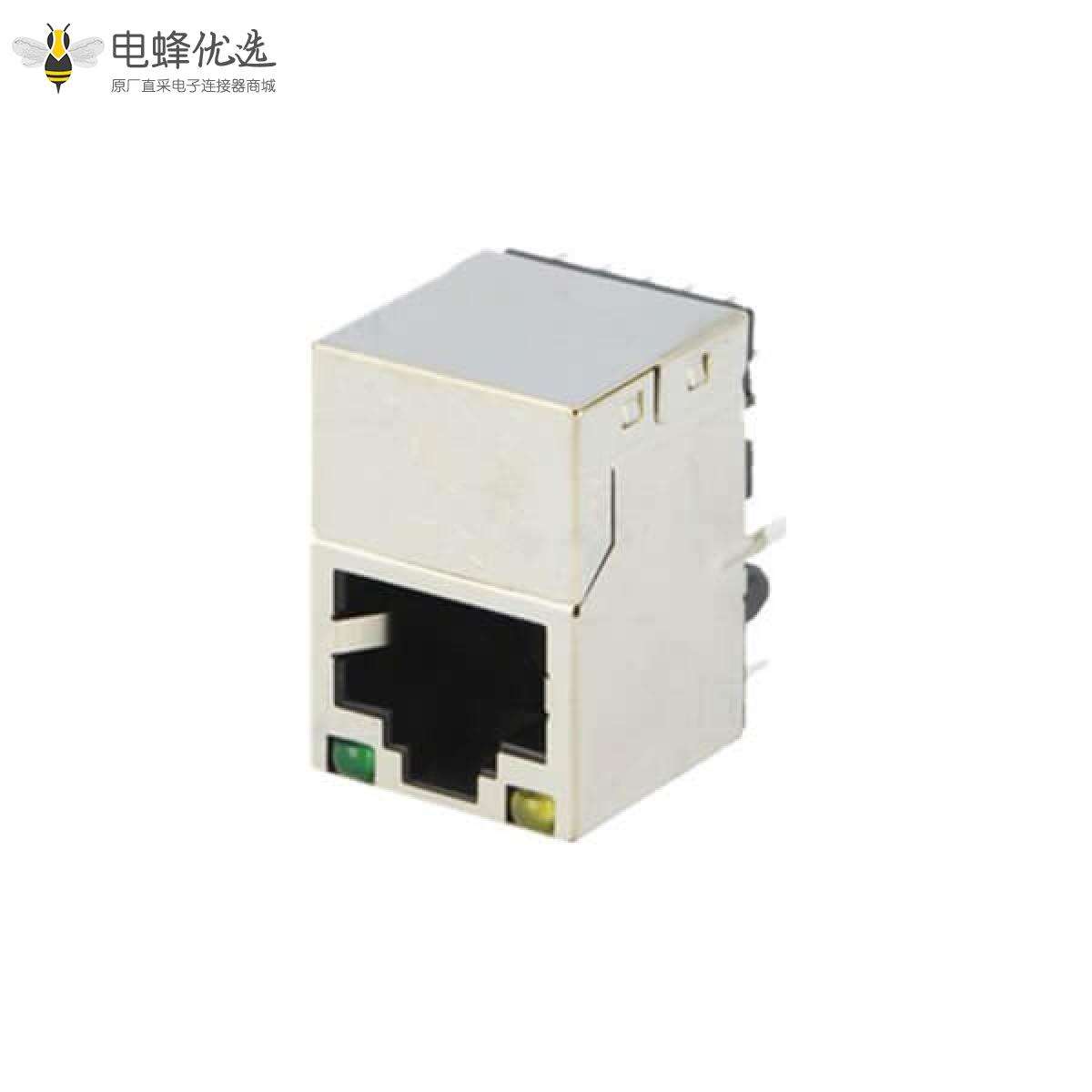 - RJ45连接器,母座,PCB板,8P8C,1*1,单层,单口,直式,屏蔽,带弹片,带灯,不带滤波器,铜壳,镀镍;